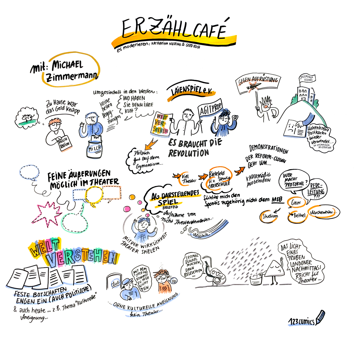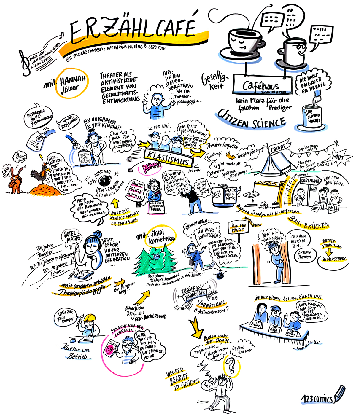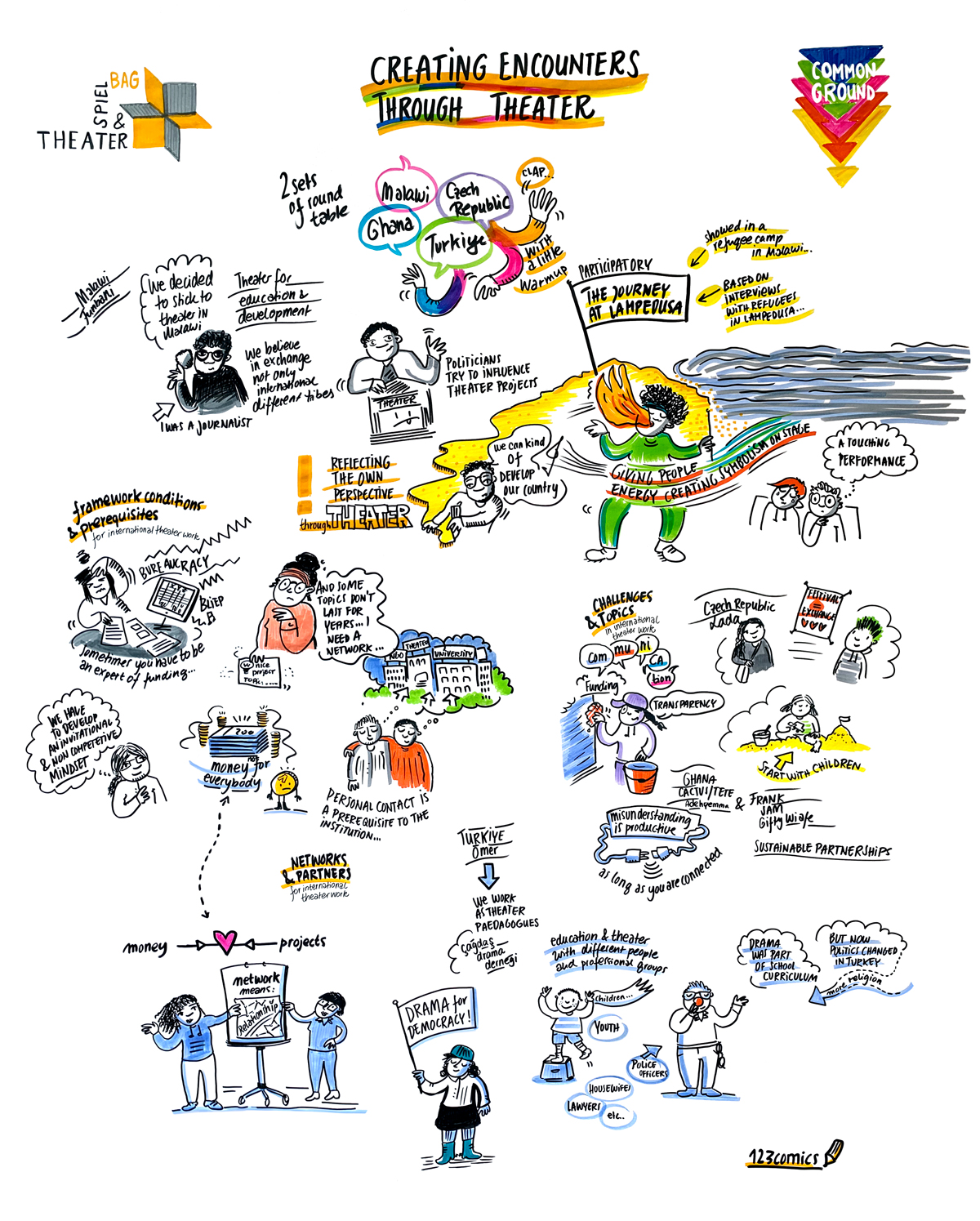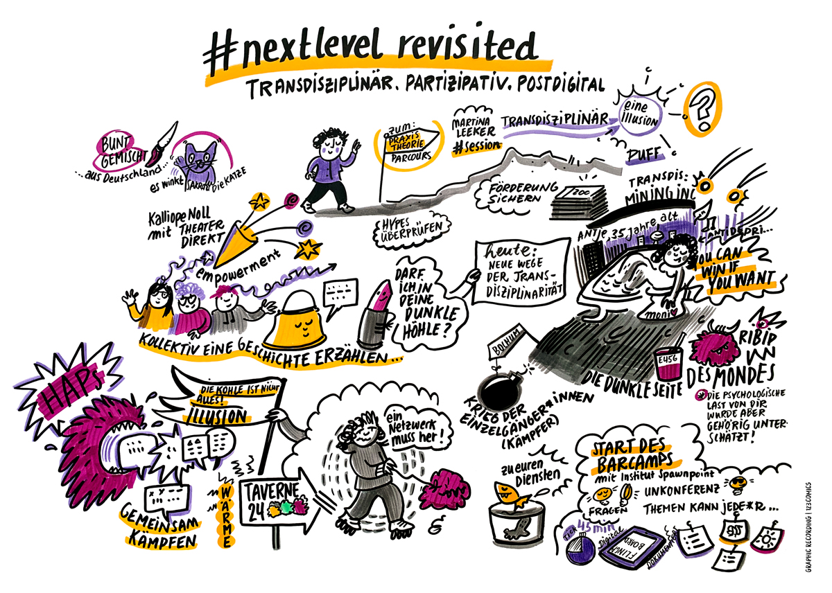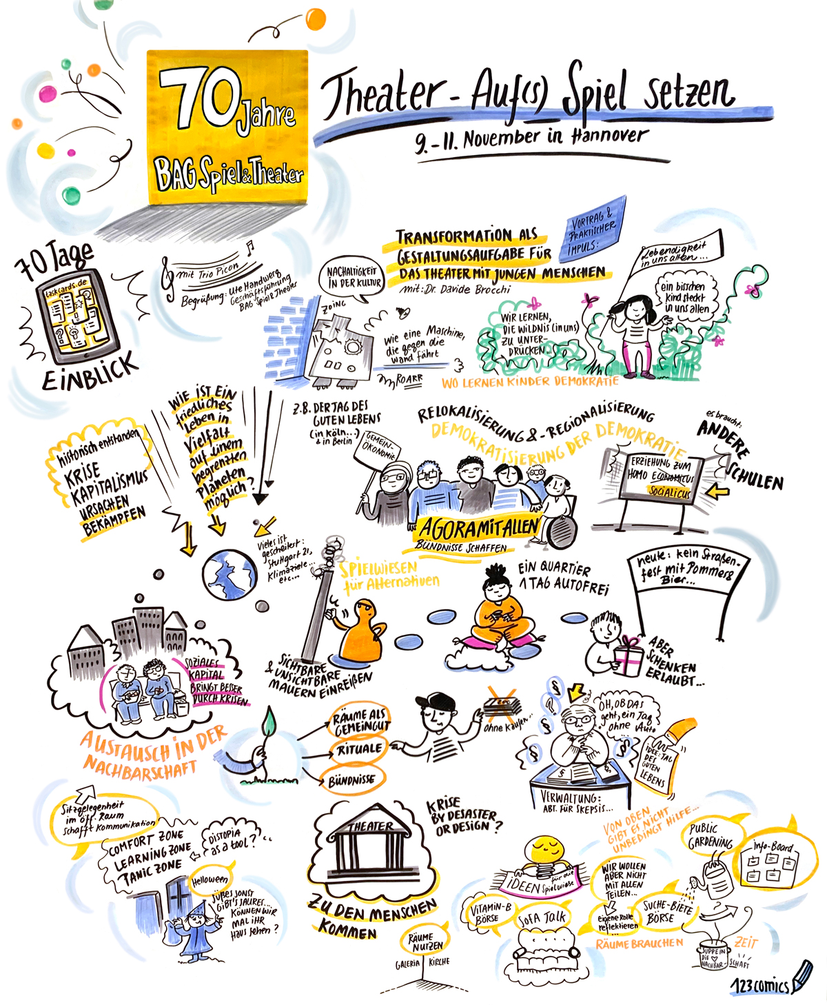 Wir haben uns gefreut, die Veranstaltung zum 70jährigen Jubliläum der Bundesarbeitsgemeinschaft Spiel & Theater durch Graphic Recording zu begleiten. Seit vielen Jahren fühlen wir uns verbunden mit der BAG Spiel & Theater. Auch im Rahmen der internationalen Konferenz "Creating Encounters Trough Theater" und für das digitale Barcamp #nextlevel haben wir die Inputs und Diskussionen gezeichnet. Einige Illustrationen für #nextlevel wurden auch in der gleichnamigen Broschüre veröffentlicht.
