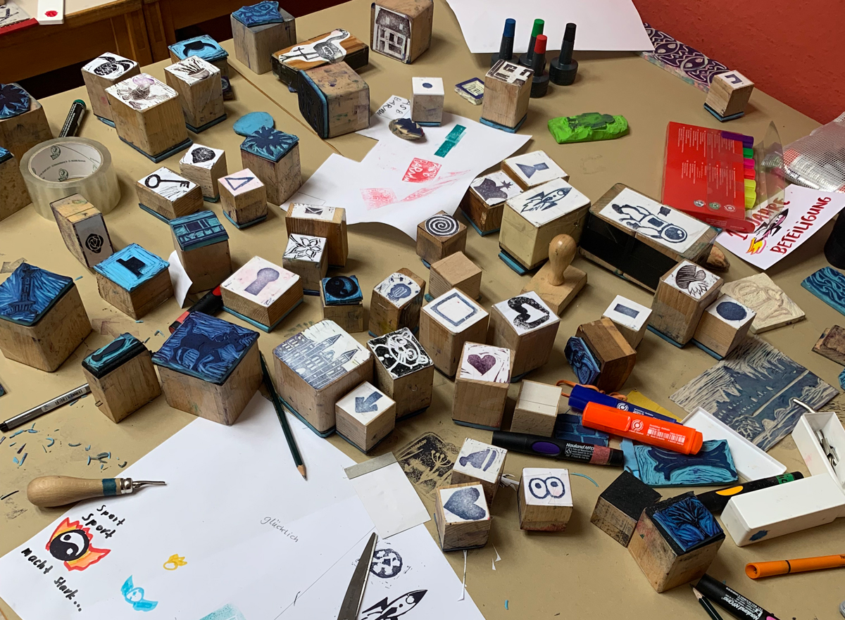 In unserem Workshop haben die Teilnehmer*innen unter dem Motto "Beteiligung macht stark" nach einem gemeinsamen Brainstorming eigene Stempel entworfen und geschnitzt. Unsere in den vergangenen Workshops enstandene Stempel-Bibliothek war auch mit dabei. Es sind viele schöne und audrucksstarke Postkarten entstanden.